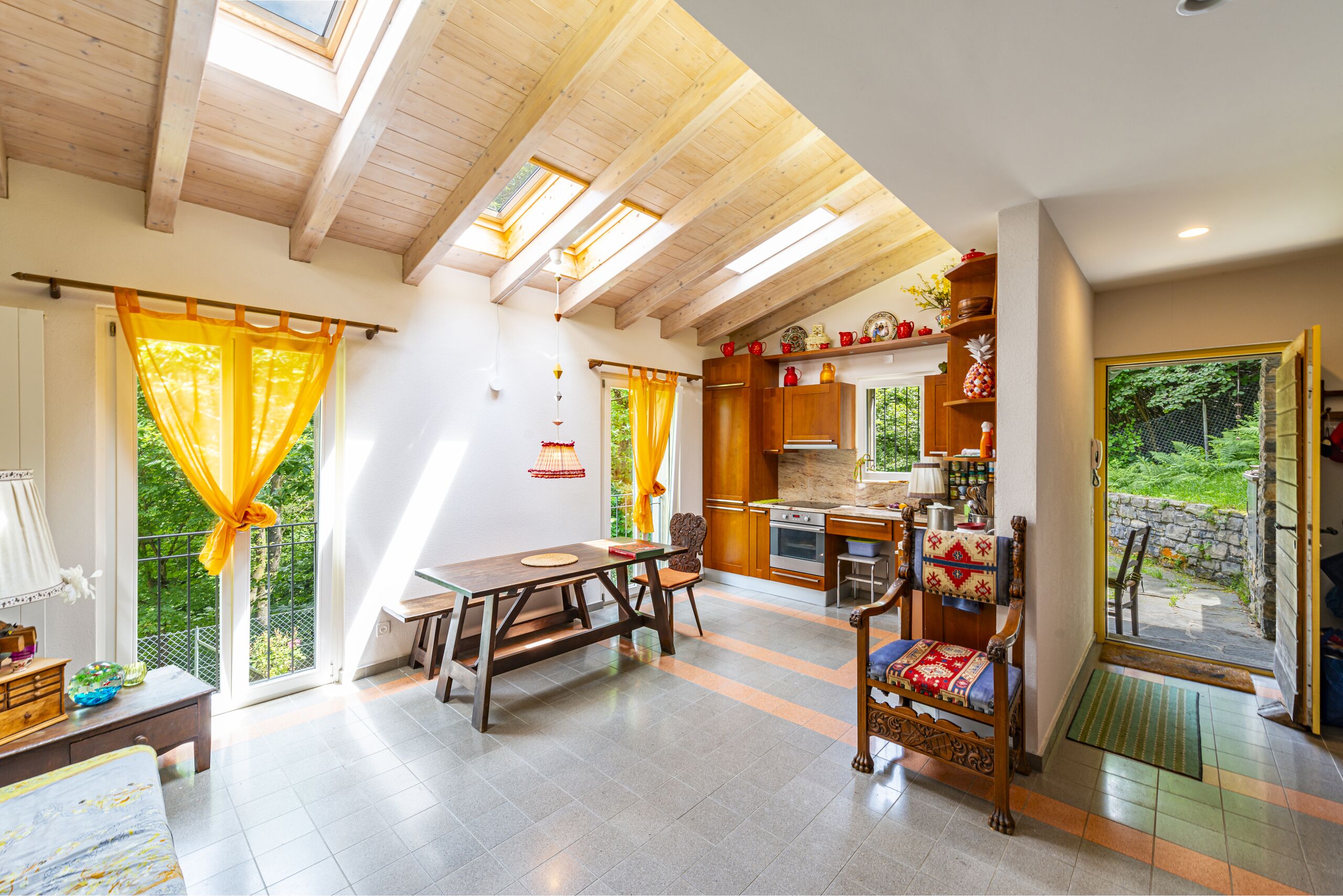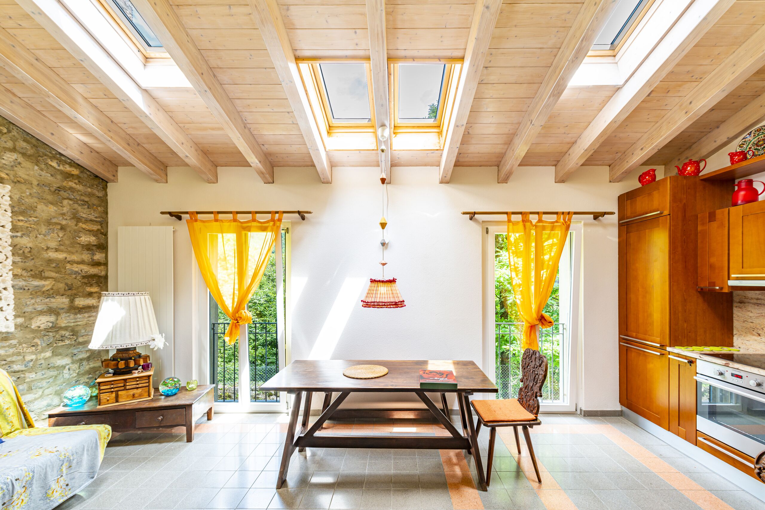 Es handelt sich um ein typisches Tessiner Doppelhaus, das sorgfältig renoviert wurde, um seinen authentischen Charakter zu erhalten. Die Natursteinfassaden und das Dach mit Sichtbalken verleihen dem Haus einen rustikalen und gemütlichen Stil, der sich perfekt in den lokalen Kontext einfügt.