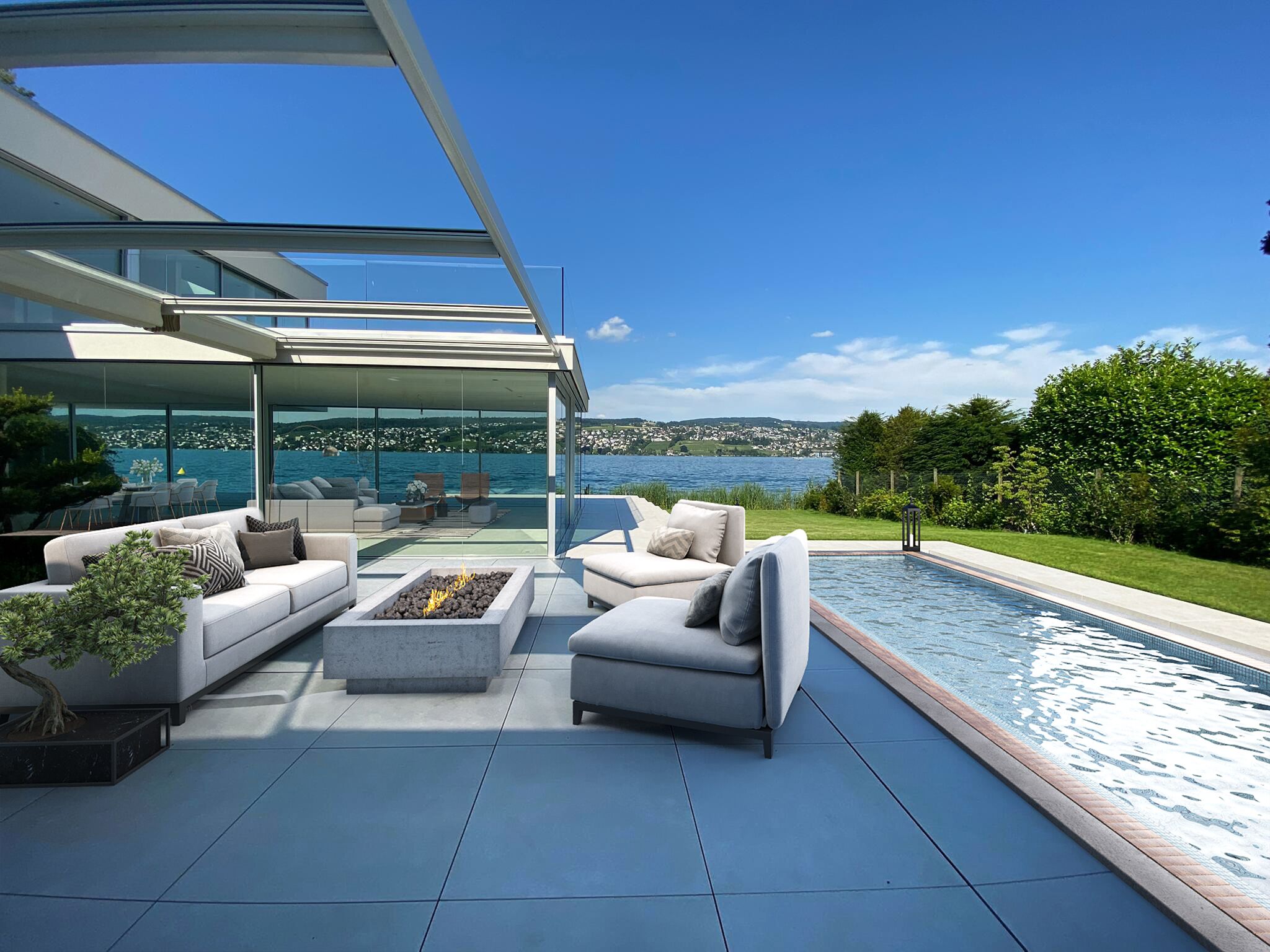 Discover a unique opportunity to live directly on the picturesque shores of Lake Zurich, just 10 minutes from the vibrant city center. This modern luxury villa seamlessly combines contemporary design with an open and light-filled floor plan, creating a sense of spaciousness and freedom.