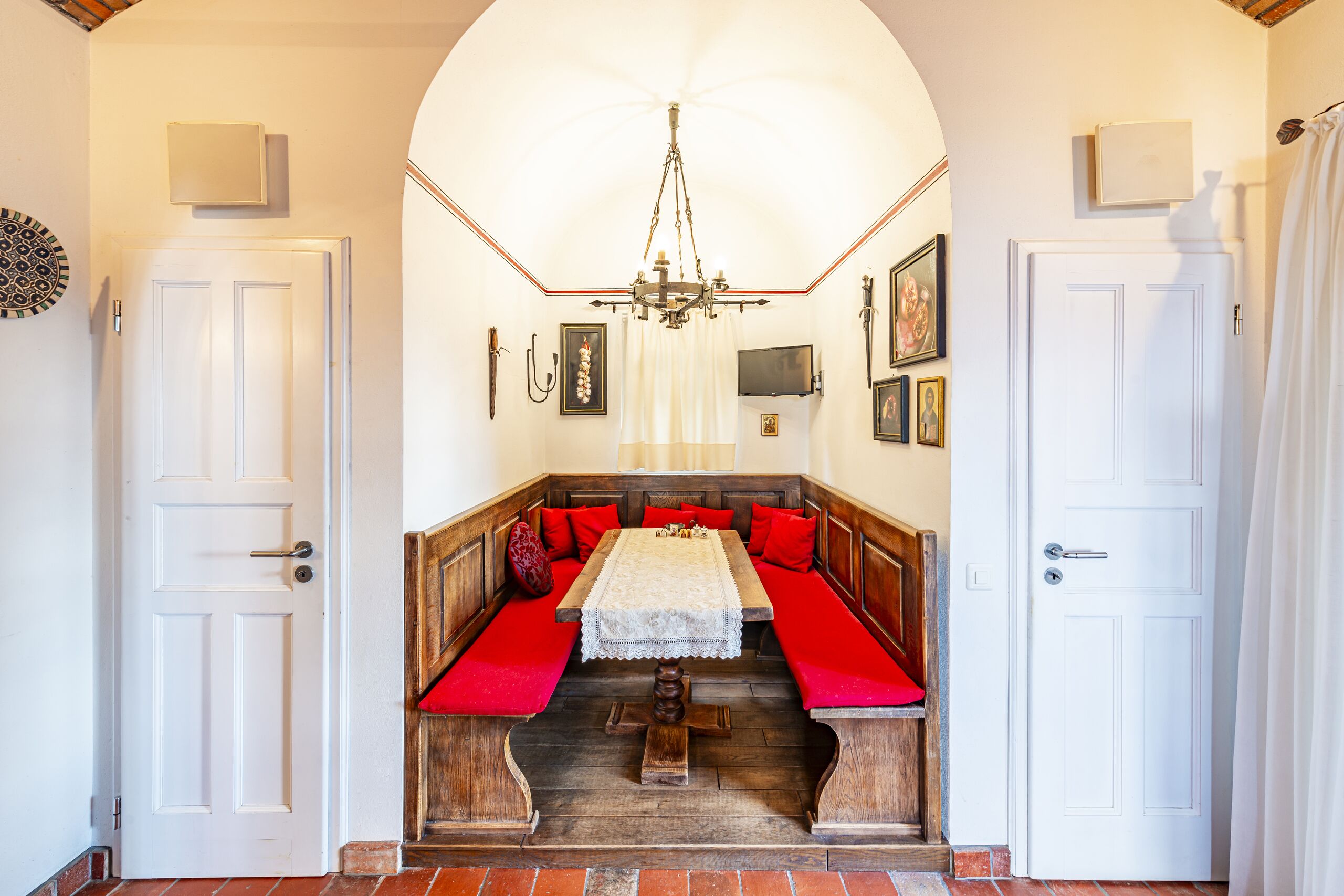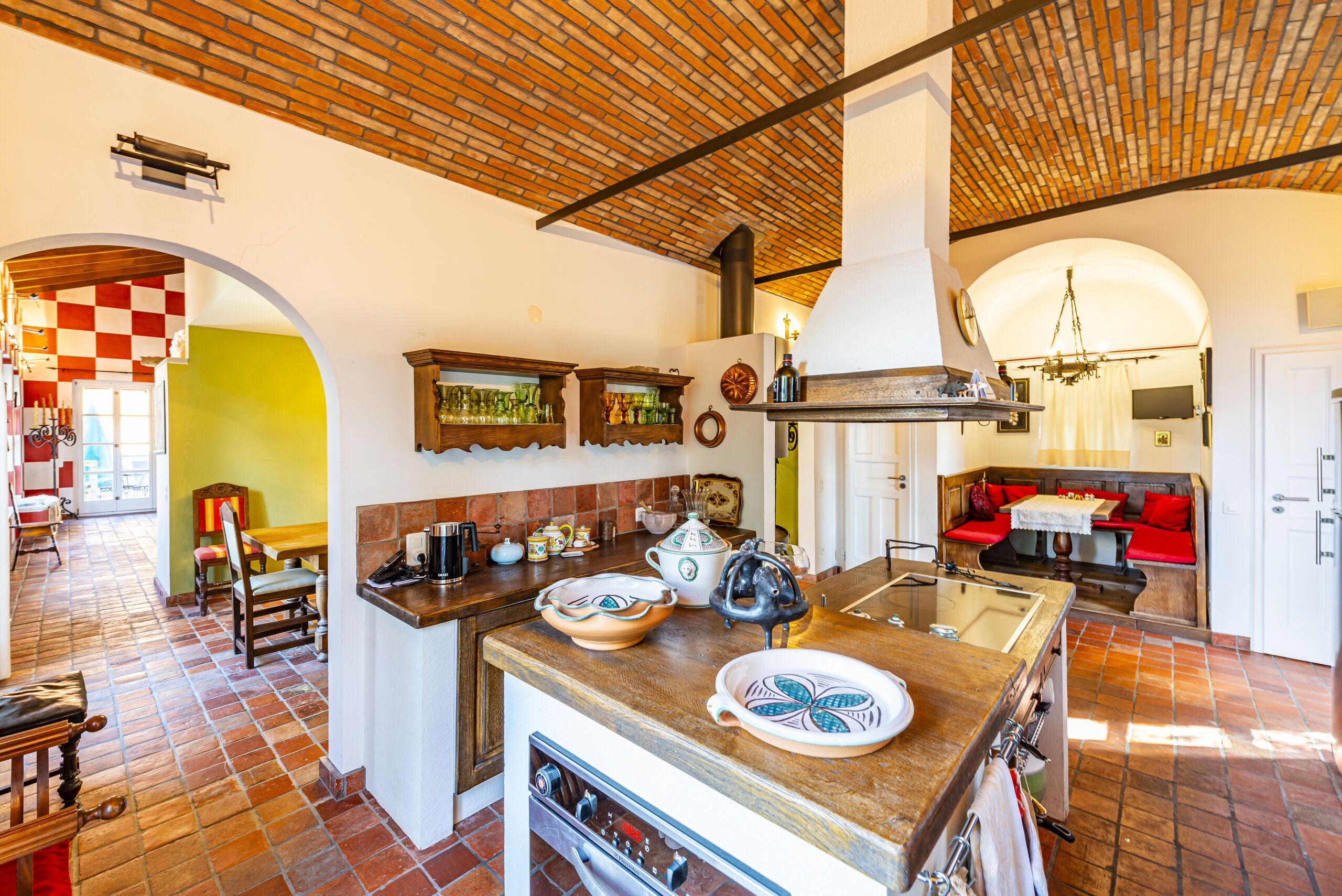 Un ampio atrio d’ingresso introduce alla zona giorno, composta da un luminoso soggiorno con camino, una sala da pranzo e una cucina abitabile con camino e suggestivo soffitto a volta in mattoncini a vista. Completano il piano una grande terrazza panoramica, toilette per ospiti, dispensa, ripostiglio, due ulteriori terrazze e una scala interna che collega i vari livelli.